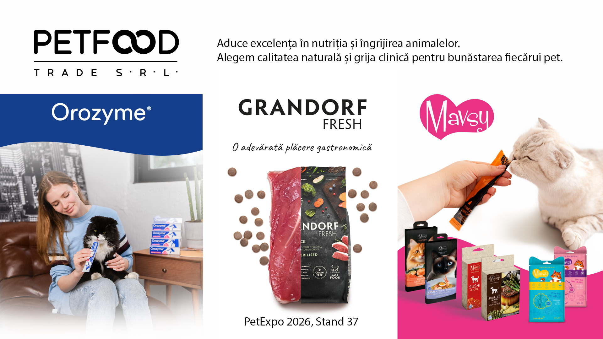 PetFoodTrade aduce excelența în nutriția și îngrijirea animalelor. Distribuim brandurile de top Mavsy, Grandorf și Orozyme, oferind soluții premium pentru sănătate. Alegem calitatea naturală și grija clinică pentru bunăstarea fiecărui animal de companie.
